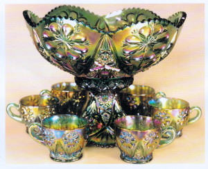 FOUR-SEVENTY-FOUR PUNCH SET (Imperial). This set is readily found in marigold, but is very scarce in green and rare in purple. This pattern was also made in a water set, milk pitcher, vases, and stemware in various sizes and shapes.