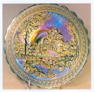 NU-ART HOMESTEAD PLATE (Imperial). Much of the green produced by Imperial was helios, a silvery type of iridescence which has never been popular with most collectors. Not so the green used on this Homestead plate. It is almost an emerald green with stretchy iridescence. Two green Homestead plates sold at auction in 1986. Each brought $950.