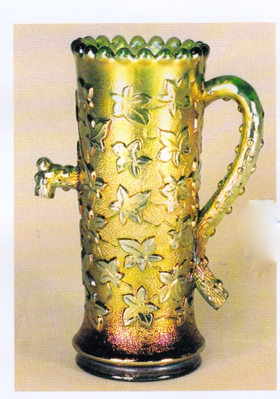 SINGING BIRDS MUG (Northwood). The mug in this popular pattern is found in so many different colors and shades that I will not attempt to list them. John Britt could write a book on this mug alone. The one shown here in green is a bit scarce and will bring around $250 at auction. Stippling will almost double the value. It is very rare in white, ice blue, and aqua opal.