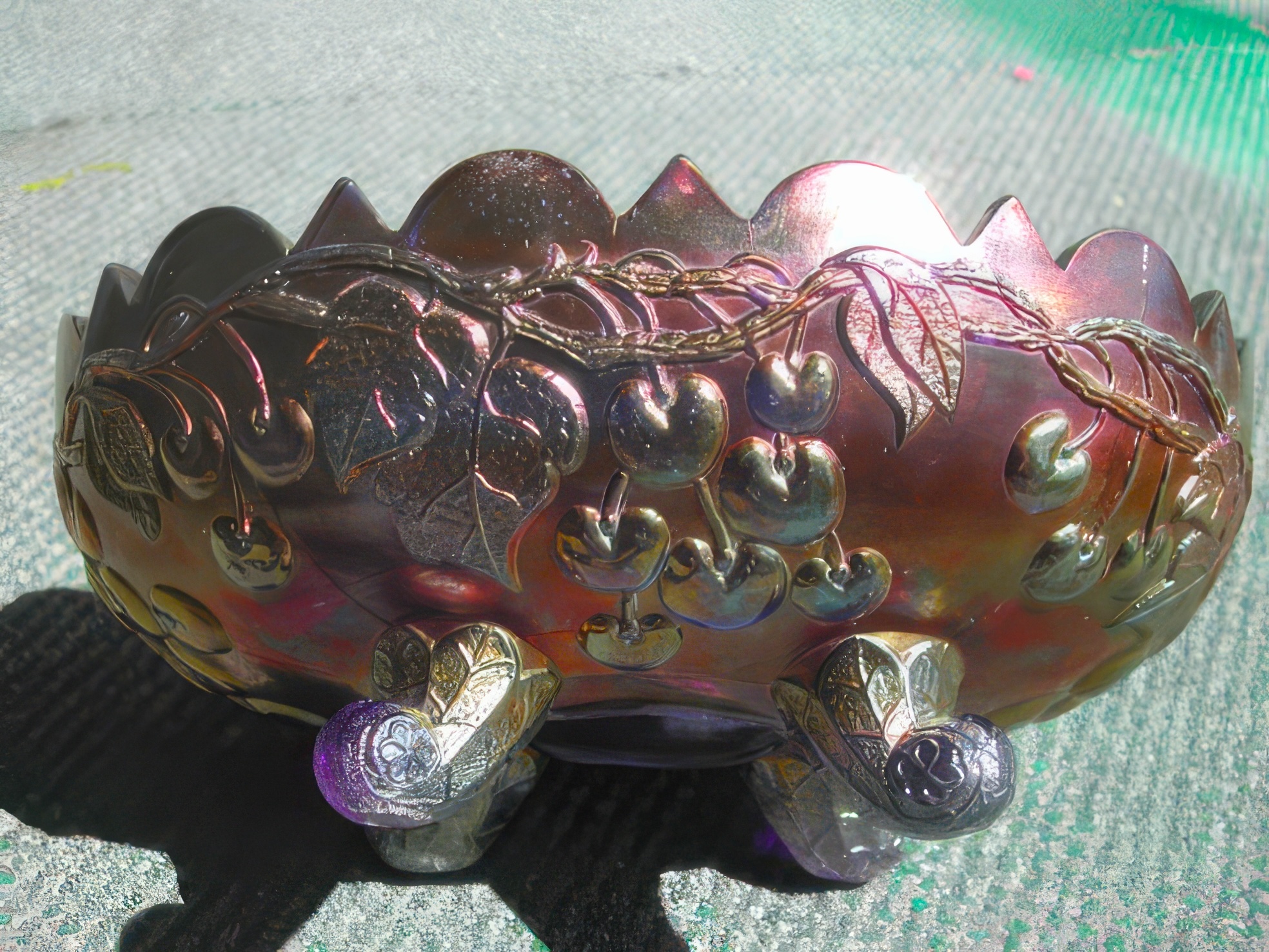 My husband retired a year ago and we moved to a little mountain community in the foothills of the Southern Sierra Nevada in the Great Central Valley of California. I began to browse through little antique shops in nearby towns once we unpacked. In Porterville, I came upon a small shop where two bluish iridescent vases caught my eye. I bought one and put the other on layaway. I had never in my life put something on layaway. When I returned to pay off and claim my second vase, the store owner told me she had a lovely old piece of carnival glass that I had completely overlooked. The piece was just exquisite and unusual.