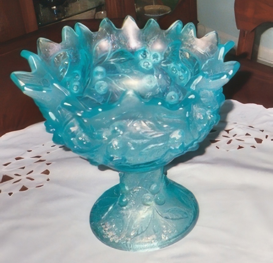 Recently a friend called and asked if Les & I were aware that an Ice Blue Acorn Burrs Punch Bowl was being offered for sale in Memphis the next day, and were we going. No, we were not aware, and yes, we were going! We located the advertisement–it was an estate tag sale, except for this punch bowl, which would be sold to the highest bidder at 12:00 noon. The terms of the sale were cash or certified check! By this time the bank was closed, so we decided to use the evening for research, which of course, included calling our good carnival glass friends the Rogers and the Stremmings and asking their opinions on value, availability, etc. As always, they were very helpful and encouraging.