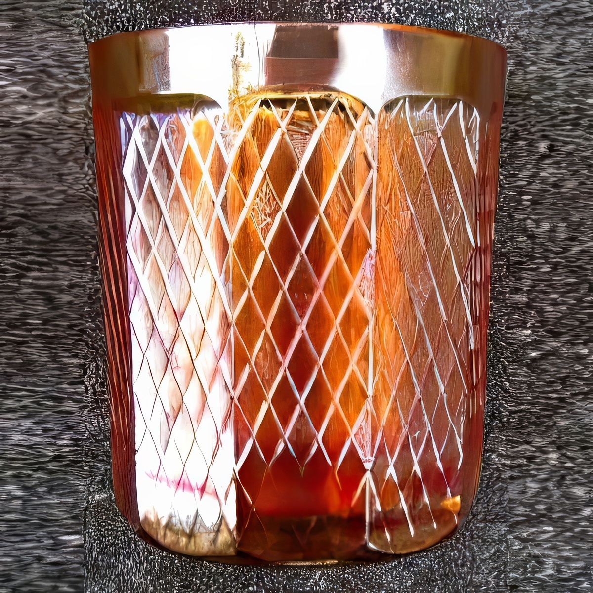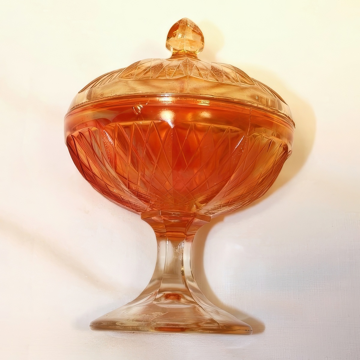 The piece we have is 3 3/4 inches tall, 3 1/8 inches in diameter. It has ten panels each with a rounded top and bottom. It has a 24 rayed star in the base with alternating long and short rays. All around the item are diamonds. One row is smooth and the next row has every other diamond stippled. There is a plain band around the top. It has two mold lines.